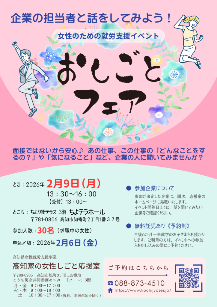 2月9日(月)に開催する『女性のための就労支援イベント・おしごとフェア』のご案内です。面接ではないから安心♪ あの仕事、この仕事の「どんなことをするの?」や「気になること」など、企業の人に聞いてみませんか?